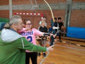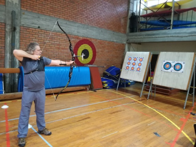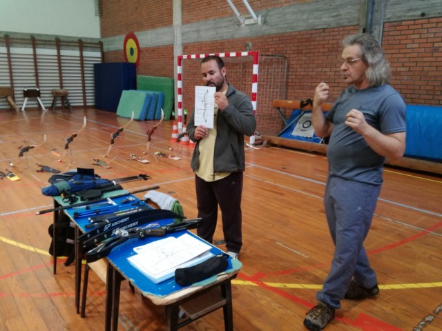Após o aquecimento, conduzido pelo docente Nuno Sousa, foi verificado o olho diretor de cada aluno. De seguida, a turma foi dividida em dois grupos e atribuídos os arcos mais adequados à constituição física e lateralidade de cada aluno.