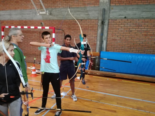 Realizou-se no passado dia 12 de outubro, no ginásio da escola, uma aula conjunta de iniciação ao tiro com arco, com a turma 7º5, lecionada pelo docente de Educação Física, Nuno Sousa, e pelos docentes de Projeto Multidisciplinar, Gil Rodrigues e Cristina Azevedo.