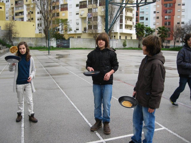 For the second consecutive year, our school had its Pancake Race last February 23rd. This year, 10 teams from 3 classes (7º1, 7º5 and 8º1) showed their skills at running and flipping pancakes, cheered by their enthusiastic supporters.