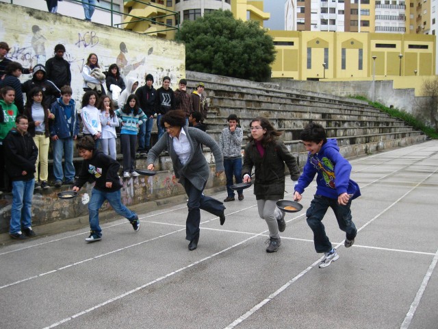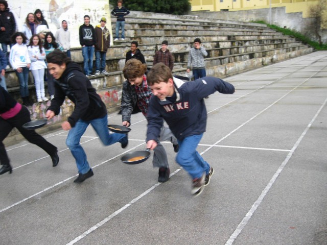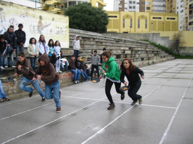 For the second consecutive year, our school had its Pancake Race last February 23rd. This year, 10 teams from 3 classes (7º1, 7º5 and 8º1) showed their skills at running and flipping pancakes, cheered by their enthusiastic supporters.